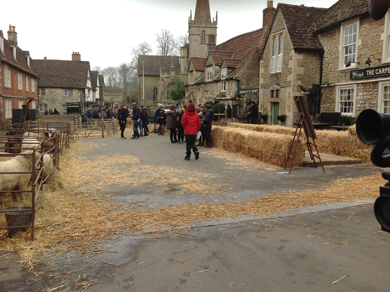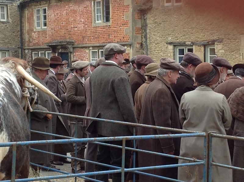 was filmed in the village in March 2015. Here are some shots we took. The cattle market area before filming. Some Extras with Jane. The cattle market with Extras during rehearsal. Lady Mary. Downton Abbey the Movie also used the village in 2018 for some scenes.